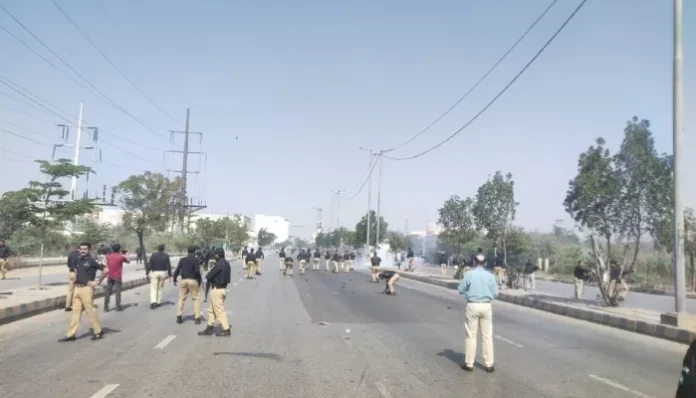 مائی کولاچی روڈ پر امریکن قونصلیٹ کے قریب ہنگامہ آرائی اور ایم ٹی خان روڈ پر مظاہرین کے پتھراؤ کے بعد پولیس کی جانب سے شدید شیلنگ کی گئی، سلطان آباد پل کے نیچے ٹریفک پولیس چوکی کو بھی آگ لگا دی گئی ہے۔