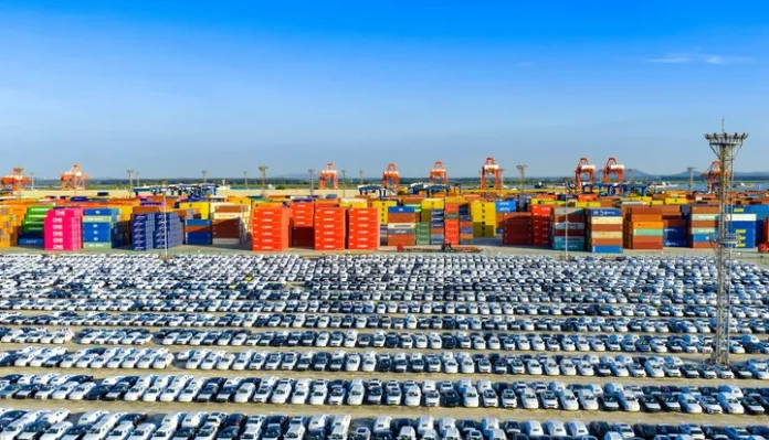 چین کے مشرقی صوبے جیانگسو کے شہر نان جنگ میں نئی توانائی کی گاڑیاں مال بردار جہازوں میں لادنے کے لئے بندرگاہ پر کھڑی ہیں-(شِنہوا)