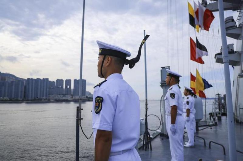 چین کے جنوبی ہانگ کانگ میں سپاہی ژان جیانگ میزائل شکن جہاز کے ڈیک پر قطار بنا کر کھڑے ہیں-(شِنہوا)