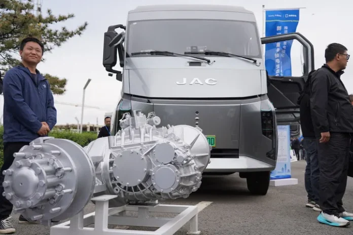 چین کے شمالی صوبہ شنشی کے شہر داتونگ میں ماحول دوست توانائی والے ہیوی ڈیوٹی ٹرک کی نمائش کی جا رہی ہے۔(شِنہوا)