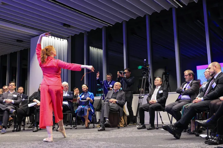 نیوزی لینڈ کے شہر ویلنگٹن میں چین سے تعلیم یافتہ خاتون طالبہ سابق طلبہ کی استقبالیہ تقریب میں بیلے رقص کر رہی ہے-(شِنہوا)