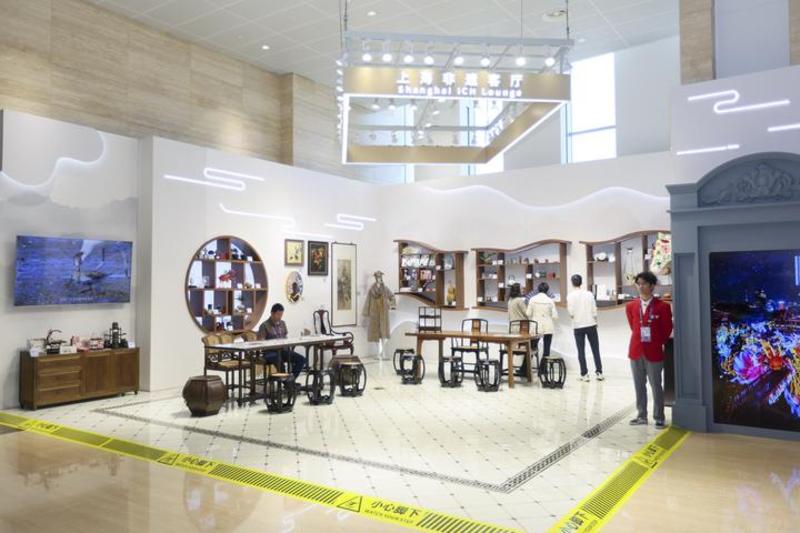 چین ، مشرقی شہر شنگھائی کے قومی نمائش و کنونشن مرکز(شنگھائی) میں 7 ویں چائنہ بین الاقوامی درآمدی نمائش  کے میڈیا مرکز میں غیرمادی ثقافت کا نمائشی علاقہ دیکھا جاسکتا ہے۔ (شِنہوا)