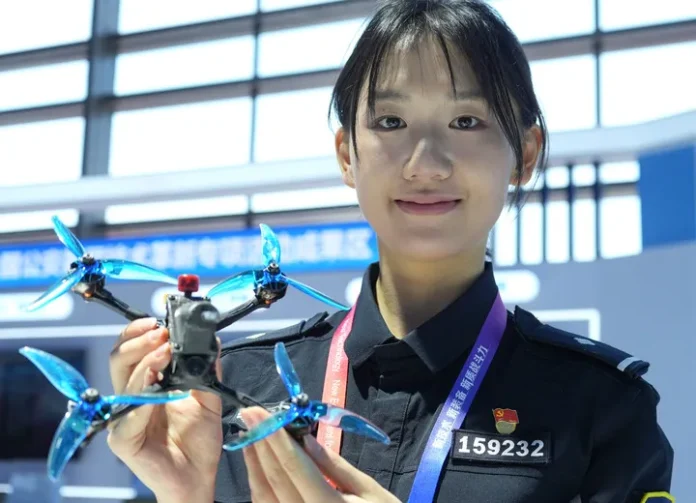 چین کے دارالحکومت بیجنگ میں پولیس آلات سے متعلق 12 ویں چین بین الاقوامی نمائش میں ایک پولیس اہلکار پولیس کے استعمال کا ڈرون دکھا رہی ہے۔(شِنہوا)