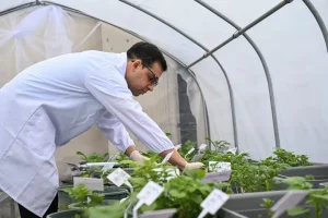 چین کے جنوب مغربی شہر چھونگ چھنگ کی ساؤتھ ویسٹ یونیورسٹی میں شریف گل آلو کی نشونما کا مشاہدہ کرتے ہوئے-(شِنہوا)
