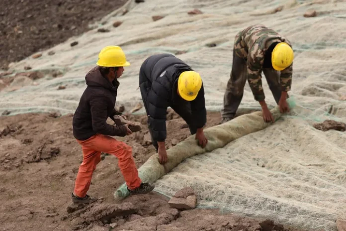 چین کے جنوب مغربی صوبے سیچھوان کی کاؤنٹی روئر گائی کے قصبہ داژاسی کے گاؤں ڈوما میں ایک غیر فعال کان کی بحالی کی جگہ پر کارکن ایک ڈھلوان پر ناریل کے چھلکوں سے بنی ہوئی چادریں بچھا رہے ہیں۔(شِنہوا)