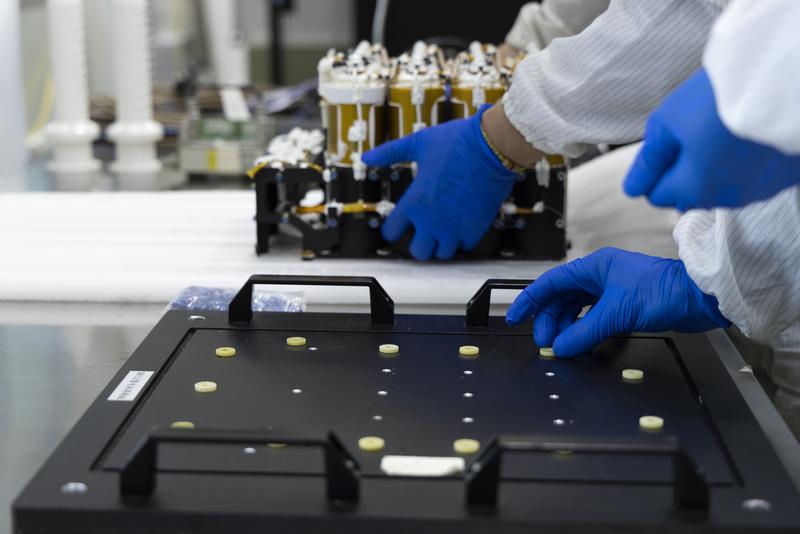 چین، مشرقی شہر شنگھائی میں چینی اکیڈمی برائے سائنس کی انوویشن اکیڈمی فار مائیکرو سیٹلائٹس کی ایک ورکشاپ میں ایک ٹیکنیشن سولر ونڈ میگنیٹواسفیئر آئنواسفیئر لنک ایکسپلورر (سمائل) کی بیٹری پیک کررہا ہے۔ (شِنہوا)