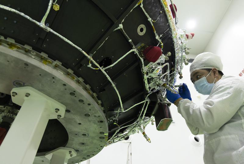چین، مشرقی شہر شنگھائی میں چینی اکیڈمی برائے سائنس کی انوویشن اکیڈمی فار مائیکرو سیٹلائٹس کی ایک ورکشاپ میں ایک ٹیکنیشن سولر ونڈ میگنیٹواسفیئر آئنواسفیئر لنک ایکسپلورر (سمائل) کی جانچ کررہا ہے۔ (شِنہوا)