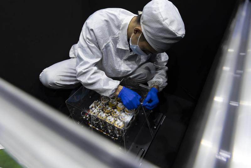 چین، مشرقی شہر شنگھائی میں چینی اکیڈمی برائے سائنسز کی انوویشن اکیڈمی فار مائیکرو سیٹلائٹس کی ایک ورکشاپ میں ایک ٹیکنیشن سولر ونڈ میگنیٹواسفیئر آئنواسفیئر لنک ایکسپلورر (اسمائل) کی جانچ کررہا ہے۔ (شِنہوا)