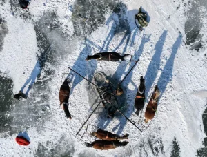 چین کے شمال مشرقی صوبے جی لین کے شہر سونگ یوآن میں چھاگان جھیل کی منجمد سطح پر گھوڑوں سے چلنے والی ونچ دکھائی دے رہی ہے۔(شِنہوا)