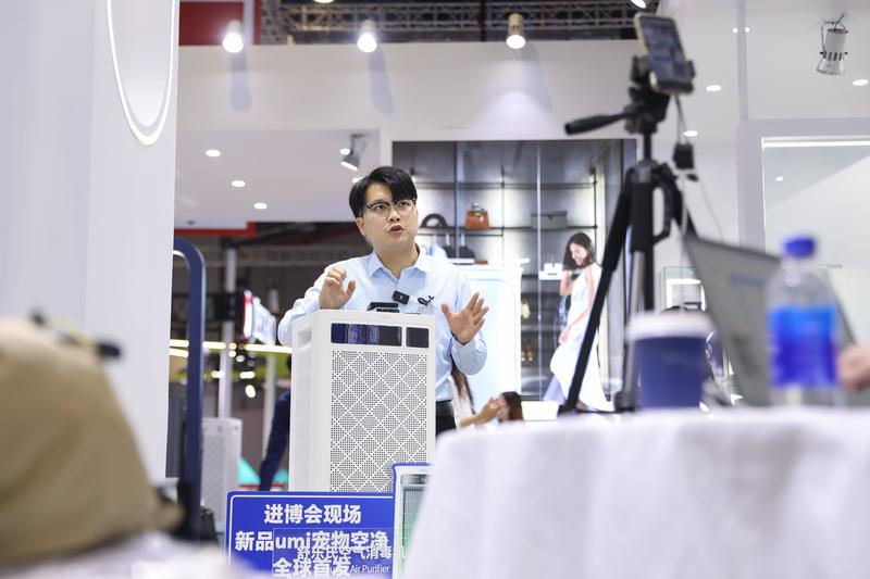 شنگھائی ، 7 ویں چین بین الاقوامی درآمدی نمائش (سی آئی آئی ای) میں پہلی مرتبہ شریک سولیئس ایئر کے بوتھ پر ایک نمائش کنندہ لائیو سٹریم کے ذریعے مصنوعات کی تشہیر کررہا ہے- (شِنہوا)