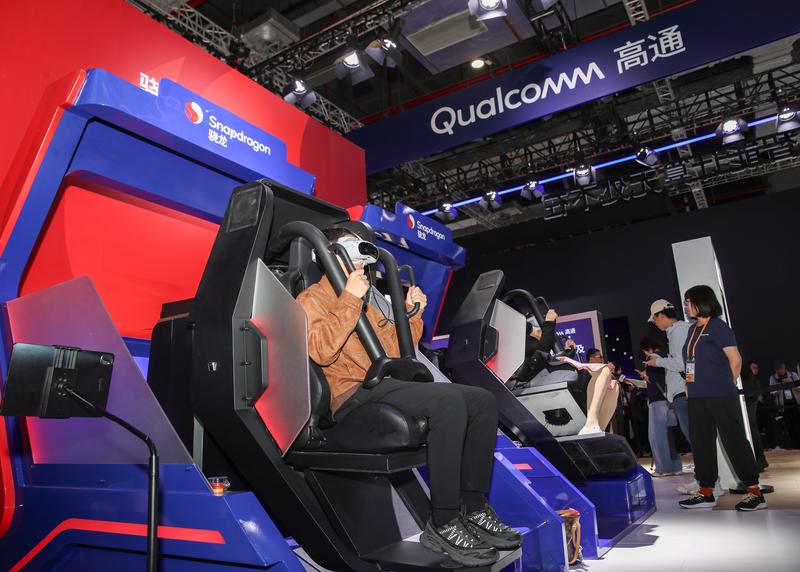 شنگھائی، 7 ویں چین بین الاقوامی درآمدی نمائش (سی آئی آئی ای) میں مستقل طور پر شرکت کرنے والی کمپنی کوال کوم کے بوتھ پر لوگ سمارٹ آلات کا تجربہ کررہے ہیں- (شِنہوا)