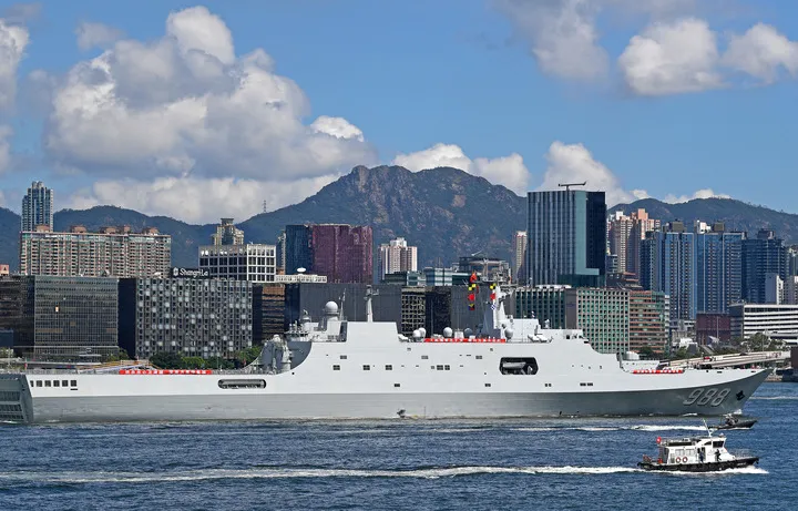 چینی پیپلز لبریشن آرمی (پی ایل اے) کا بحری جہاز یی مینگ شان چین کے جنوبی ہانگ کانگ میں وکٹوریہ ہاربر سے گزرتے ہوئے-(شِنہوا)