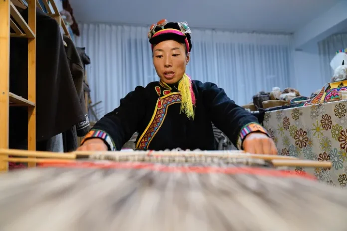 چین کے جنوب مغربی صوبے سیچھوان کے شہر یا آن کی باؤشنگ کاؤنٹی کے چھیاؤچھی تبتن ٹاؤن شپ میں نینکاسمن اپنے سٹوڈیو میں یاک کے اون سے کپڑا بنا رہی ہے-(شِنہوا)