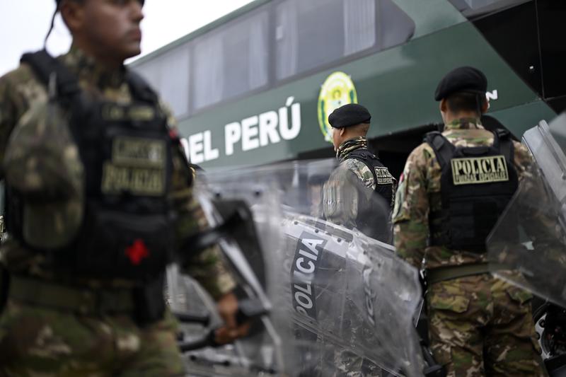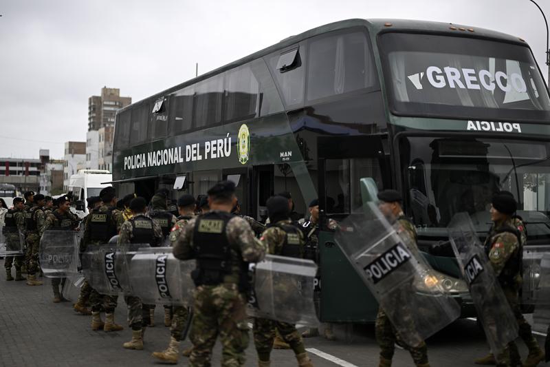 لیما میں 31 ویں ایپیک اقتصادی سربراہ اجلاس کے موقع پر کنونشن مرکز کے باہر پہرہ دینے کے لئے پولیس پہنچ رہی ہے۔ (شِنہوا)