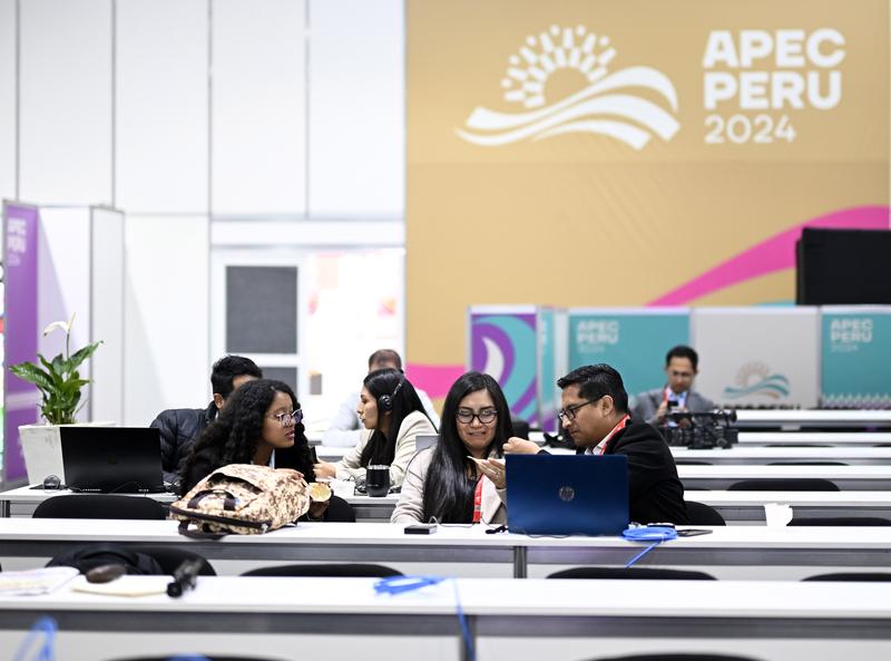 لیما میں ایپیک 2024 بین الاقوامی میڈیا مرکز میں صحافی کام کررہے ہیں۔ (شِنہوا)