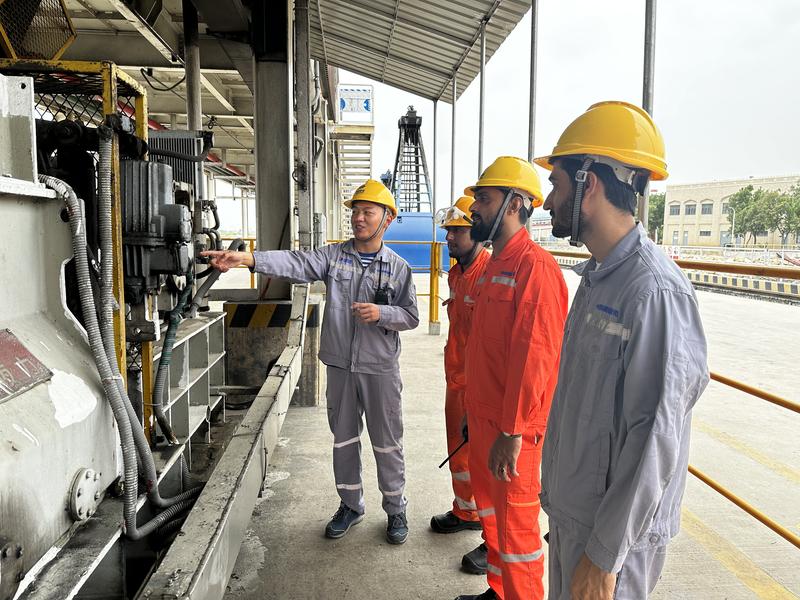 کوئلے سے چلنے والے پورٹ قاسم بجلی گھر میں چینی عملہ پاکستانی عملے کو بیلٹ کنویئر سے متعلق آگاہ کررہا ہے۔(شِنہوا)