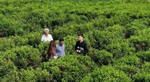 چین کے صوبے گوانگ ڈونگ کے شہر چھاؤ ژو کے فینگ ہوانگ ٹاؤن میں علی شوکت اور ان کی ٹیم کے ارکان چائے کے باغ کا معائنہ کرتے ہوئے-(شِنہوا)