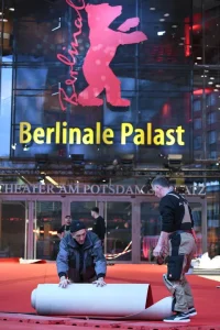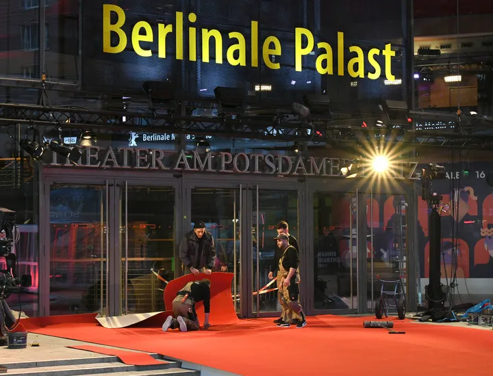 جرمنی کے شہر برلن میں برلینالے پالاسٹ کے سامنے کارکن سرخ قالین بچھا رہے ہیں-(شِنہوا)