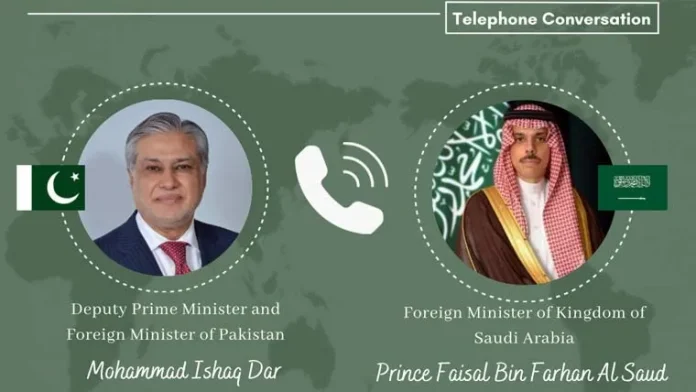 وزارت خارجہ نے سماجی رابطے کی ویب سائٹ ایکس پر پانے ایک بیان میں بتایا کہ نائب وز یراعظم و وزیرخارجہ اسحق ڈار کو سعودی عرب کے وزیرخارجہ شہزادہ فیصل بن فرحان کی ٹیلی فونک کال موصول ہوئی۔