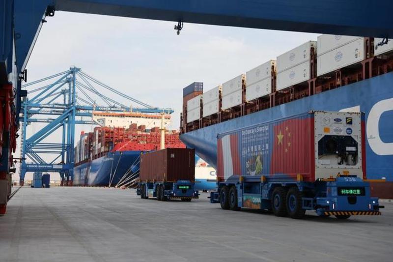 پیرومیں چنکائی بندرگاہ پرکنٹینرز لے جائے جارہے ہیں-(شِنہوا)