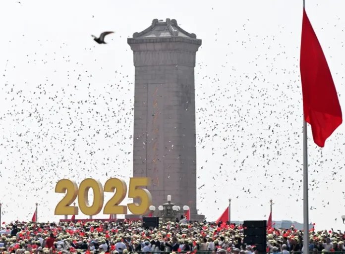 چین کے دارالحکومت بیجنگ میں جاپانی جارحیت کے خلاف چینی عوام کی مزاحمت اور فسطائیت مخالف عالمی جنگ میں فتح کی 80 ویں سالگرہ کے موقع پر منعقدہ عظیم الشان اجتماع میں کبوتر چھوڑے جا رہے ہیں-(شِنہوا)
