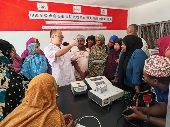تنزانیہ کے شہر زنجیبار میں چینی ماہر صحت شسٹوسو مائسز کی تشخیص کی تکنیک کا مظاہرہ کر رہے ہیں-(شِنہوا)