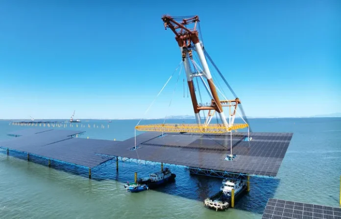 چین کے شمالی صوبے ہیبے کی کاؤنٹی چھانگ لی میں ایک آف شور شمسی توانائی پاور پلانٹ کے تعمیراتی مقام کا منظر۔(شِنہوا)