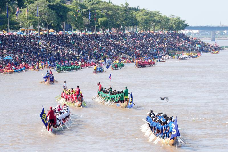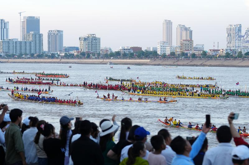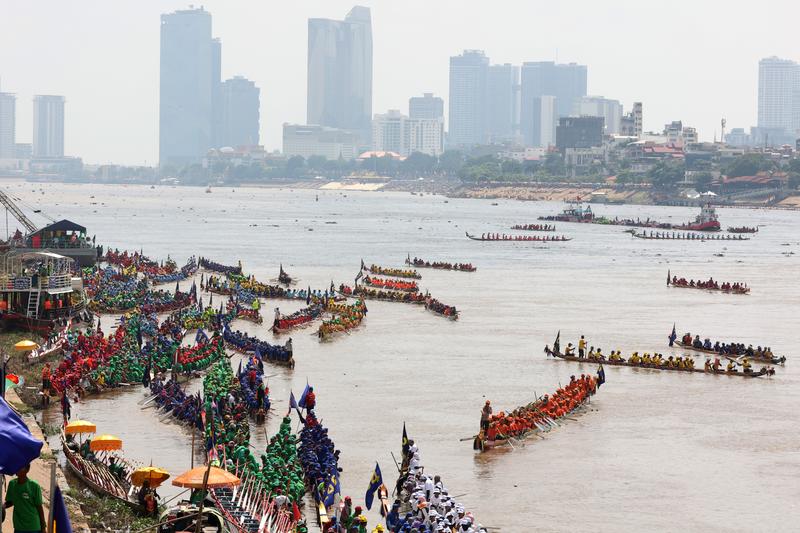 کمبوڈیا، نوم پِن کے دریائے ٹونلے سیپ میں واٹر فیسٹیول کے دوران شرکاء  کشتی رانی کے مقابلے میں شریک ہیں۔ (شِنہوا)