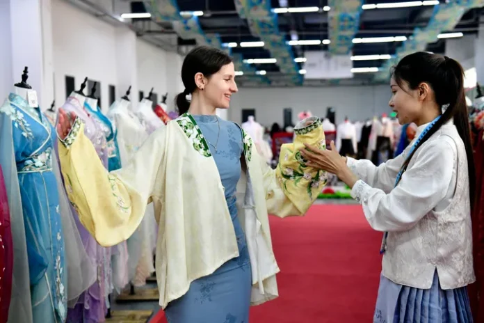 چین کے مشرقی صوبے شان ڈونگ کی کاؤنٹی کاؤشیان کے ہانفو بیس میں ایک روسی سیاح (بائیں) ہانفو لباس پہننے کی کوشش کررہی ہے-(شِنہوا)