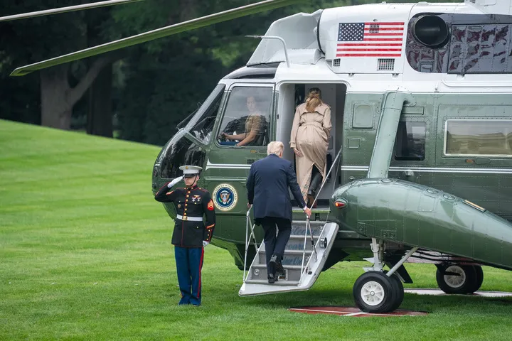 امریکی ریاست واشنگٹن ڈی سی میں امریکی صدر ڈونلڈ ٹرمپ اور خاتون اول میلانیا ٹرمپ برطانیہ کے سرکاری دورے پر روانہ ہونے کےلئے میرین ون طیارے میں سوار ہورہے ہیں-(شِنہوا)