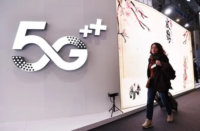 سپین کےشہر بارسلونا میں موبائل ورلڈ کانگریس (ایم ڈبلیو سی)کے دوران ایک سیاح چائنہ موبائل کے سٹال کے سامنے سے گزر رہی ہے۔(شِنہوا)