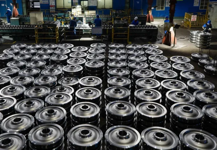 چین کے مشرقی صوبے آنہوئی کے شہر ما آن شان میں چائنہ باؤ گروپ ماسٹیل ریل ٹرانزٹ میٹریلز ٹیکنالوجی کمپنی لمیٹڈ (ایم آر ٹی) کی ورکشاپ میں کارکن  گاڑیوں کے پہیے پیک کر رہے ہیں-(شِنہوا)