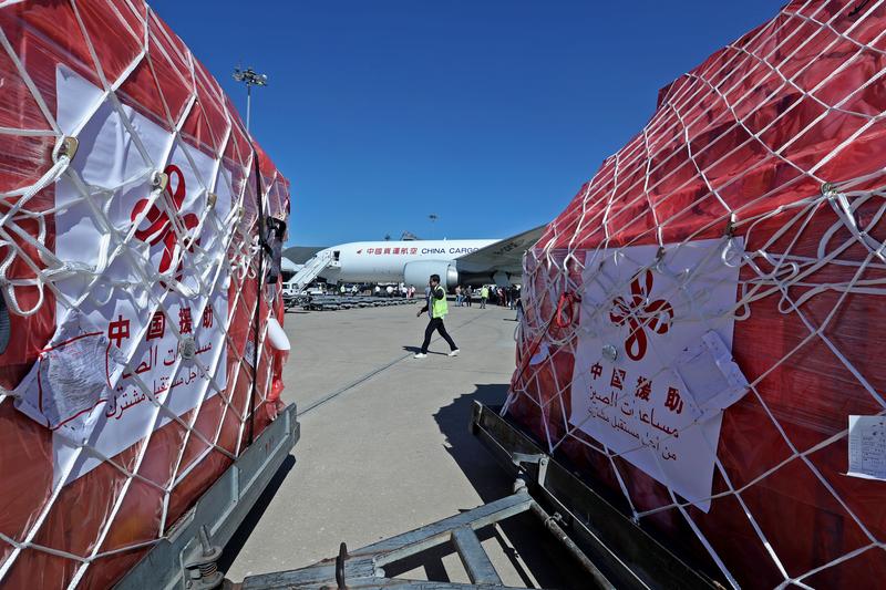 لبنان، بیروت کے رفیق حریری انٹر نیشنل ائیر پورٹ پر چین کی طرف سے عطیہ کیا گیا ہنگامی طبی امدادی سامان اتارا جارہا ہے۔(شِنہوا)
