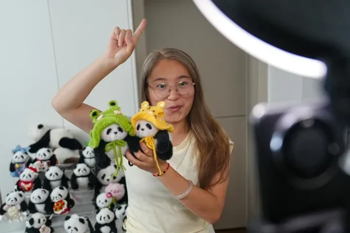 چین کے جنوب مغربی صوبے سیچھوان کے شہر چھنگ دو کی ایک کمپنی میں عملے کی رکن لائیو سٹریمنگ کے ذریعے پانڈا کی شکل کے بیگ چارمز کی تشہیر کر رہی ہے۔(شِنہوا)