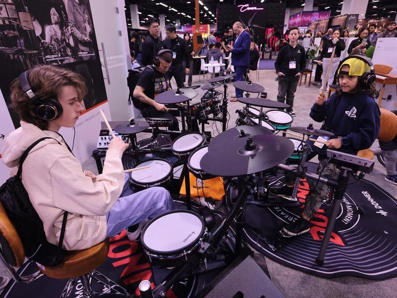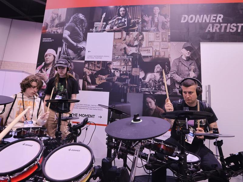 امریکی ریاست کیلیفورنیا کی اورنج کاؤنٹی کے اناہیم کنونشن سنٹر میں نیشنل ایسوسی ایشن آف میوزک مرچنٹس(این اے ایم ایم) شو 2025 کے دوران لوگ چین کے جنوبی صوبے گوانگ ڈونگ میں قائم موسیقی کمپنی ڈونر کے نمائشی حصے میں موسیقی کے آلات بجا رہے ہیں-(شِنہوا)