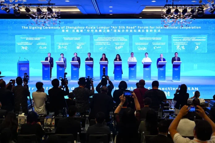 ملائیشیاکے دارالحکومت کوالالمپور میں ژینگ ژو ۔کوالالمپور ’’ایئر سلک روڈ‘‘ فورم برائے بین الاقوامی تعاون پر دستخطوں کی تقریب کا منظر۔(شِنہوا)
