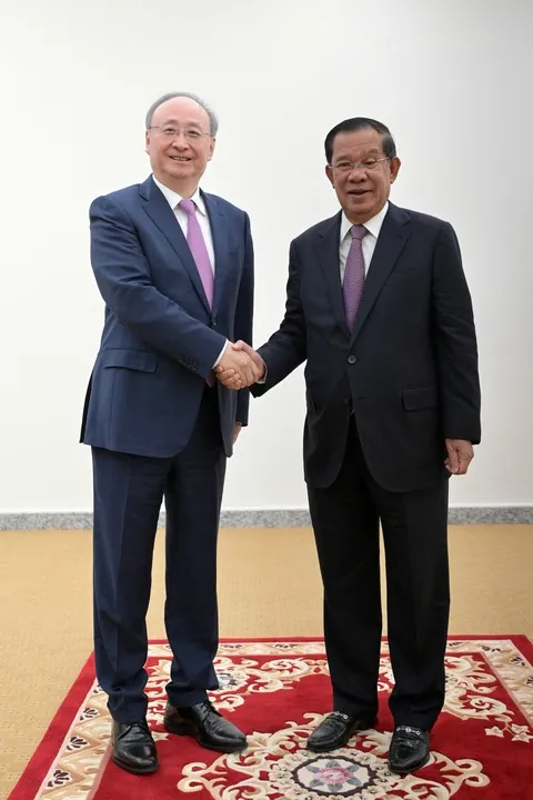 کمبوڈین پیپلز پارٹی (سی پی پی) اور کمبوڈیا کی سینیٹ کے صدر سمدیچ تیکو ہن سین کمبوڈیا کے دارالحکومت نوم پنہ میں کمیونسٹ پارٹی آف چائنہ (سی پی سی) کی مرکزی کمیٹی کے سیاسی بیورو کے رکن اور سی پی سی بیجنگ میونسپل کمیٹی کے سیکرٹری یِن لی کے ساتھ ملاقات کے موقع پر مصافحہ کررہے ہیں۔(شِنہوا)