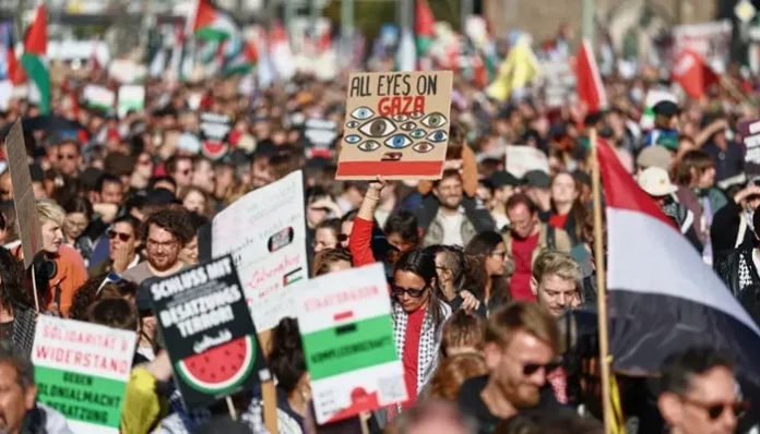 جرمنی کے دارالحکومت برلن میں غزہ میں اسرائیل کی جانب سے کی جانے والی نسل کشی کے خلاف 1 لاکھ سے زائد افراد سٹرکوں پر نکل آئے۔