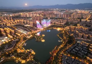 چین کے شمال مغربی صوبے شانشی کے شہر شی آن کے چھو جیانگ نئے ضلع کا ایک خوبصورت منظر۔(شِنہوا)