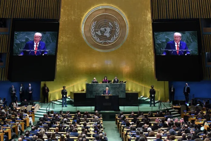 امریکی صدر ڈونلڈ ٹرمپ اقوام متحدہ کے صدر دفتر میں جنرل اسمبلی کے 80 ویں اجلاس سے خطاب کررہے ہیں-(شِنہوا)
