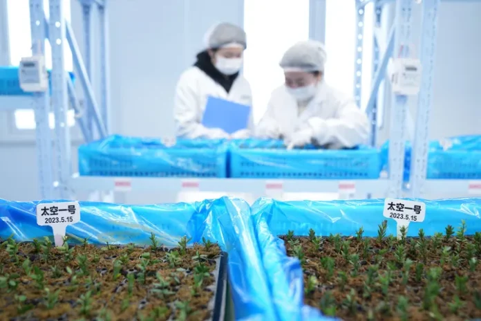 چین کے شمال مشرقی صوبے حئی لونگ جیانگ کے فویوآن میں کرین بیری کے کاشتکاری علاقے میں قائم تحقیق و ترقی مرکز میں تیکنیکی ماہرین کرین بیری کی پنیری کی جانچ پڑتال کر رہے ہیں۔(شِنہوا)
