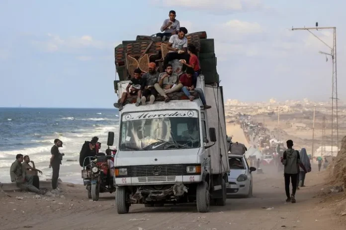 وسطی غزہ کی پٹی کے علاقے النصیرات کے قریب فلسطینی شہری سمندر کے کنارے نقل مکانی کررہے ہیں-(شِنہوا)