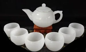 ایک چائے دان،6 کپ اور ایک فیئر کپ پر مشتمل خصوصی تیار کردہ قیمتی پتھر کے چائے کا خوبصورت سیٹ دیکھا جا سکتا ہے۔(شِنہوا)