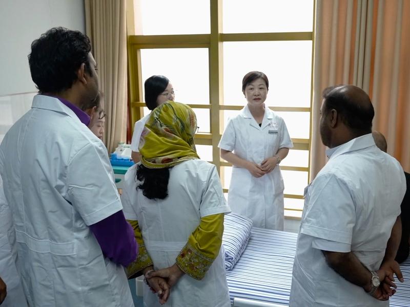 ڈاکٹر لو بیدان (دائیں جانب سے دوسرے نمبر پر) وارڈ میں تربیت حاصل کرنے والے پاکستانی افراد کو آکوپنکچر کی تعلیم دے رہی ہیں۔(شِنہوا)