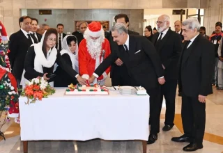 The Hon’ble Chief Justice of Pakistan, the Hon’ble Judges of the Supreme Court of Pakistan, and the President of the Supreme Court Bar Association joined employees and security staff from the Christian Community in marking the joyous occasion of Christmas by cutting a festive cake at a special ceremony held at the Supreme Court of Pakistan today. The event was attended by employees from the Christian community, fostering an atmosphere of inclusivity, harmony, and mutual respect.