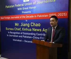 Speaking at the award-giving ceremony in Islamabad, PFUJ President Muhammad Nawaz Raza said the decision was made after a comprehensive review of foreign journalists who had served in Pakistan. “When the PFUJ decided to begin honouring foreign journalists who served in Pakistan, Jiang Chao stood at the top of all categories after careful scrutiny. His professionalism and credibility have earned him respect not only in Islamabad but across the country,” he said.